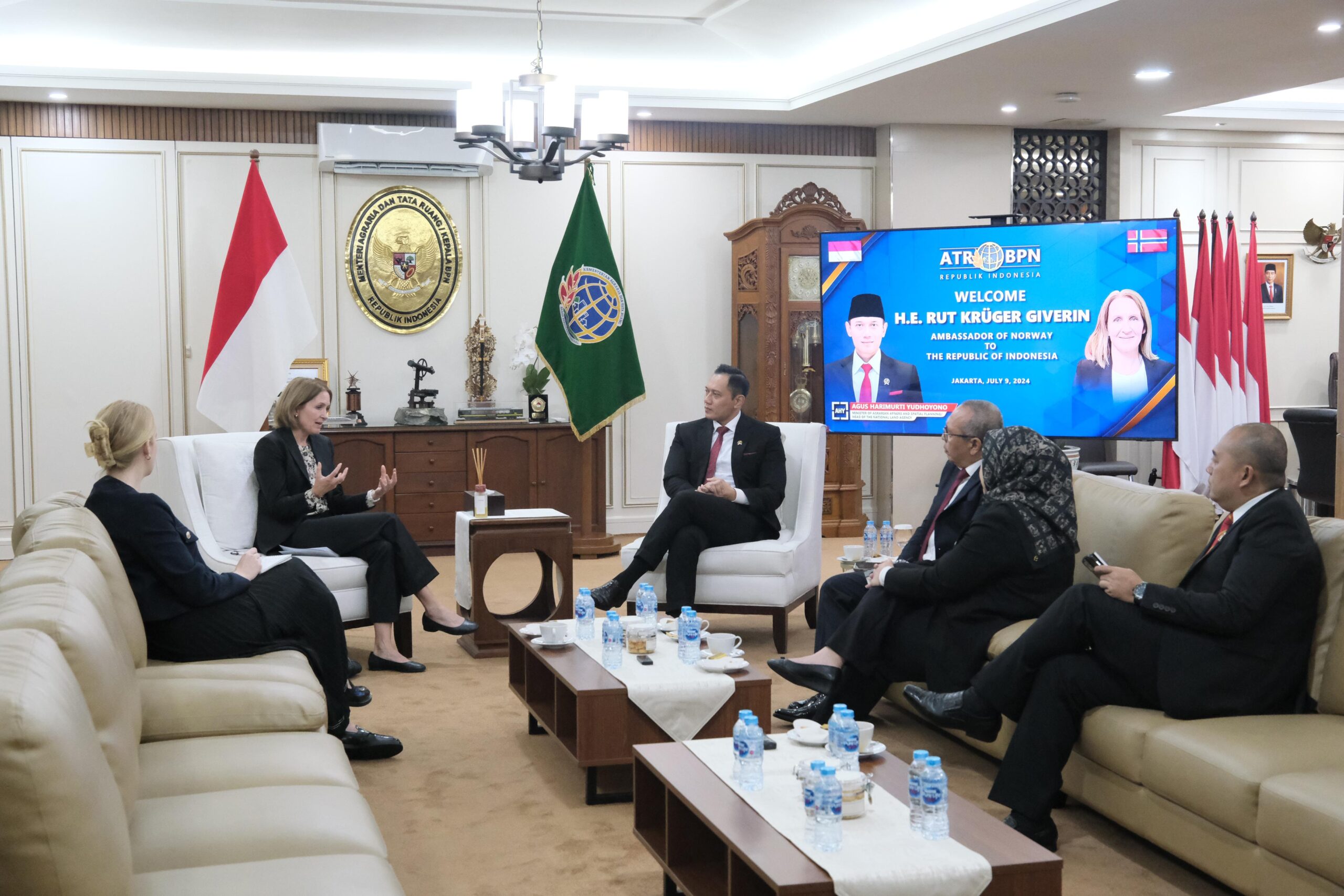 Jakarta – Menteri Agraria dan Tata Ruang/Kepala Badan Pertanahan Nasional (ATR/BPN), Agus Harimurti Yudhoyono (AHY) menerima kunjungan Duta Besar Norwegia untuk Indonesia, Rut Kruger Griven di Ruang Menteri, Kementerian ATR/BPN, Jakarta pada Selasa (09/07/2024).